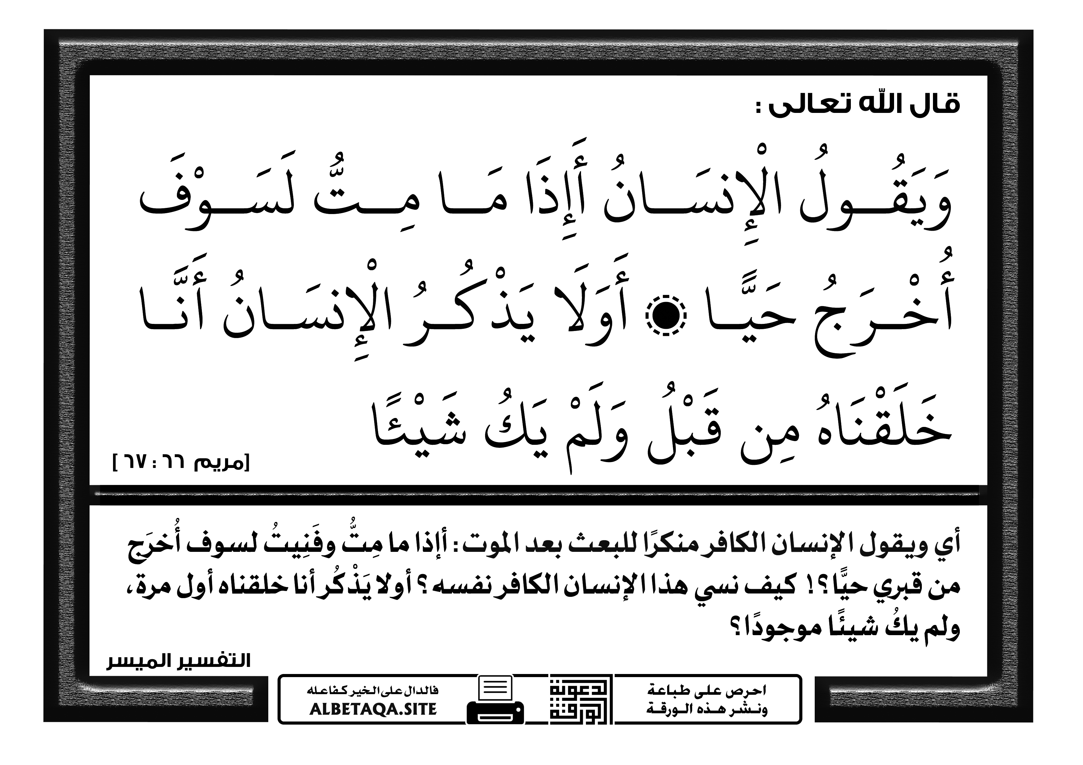 ويقول الإنسان أإذا ما مت لسوف أخرج حيا ، أولا يذكر الإنسان أنا خلقناه من قبل ولم يك شيئا