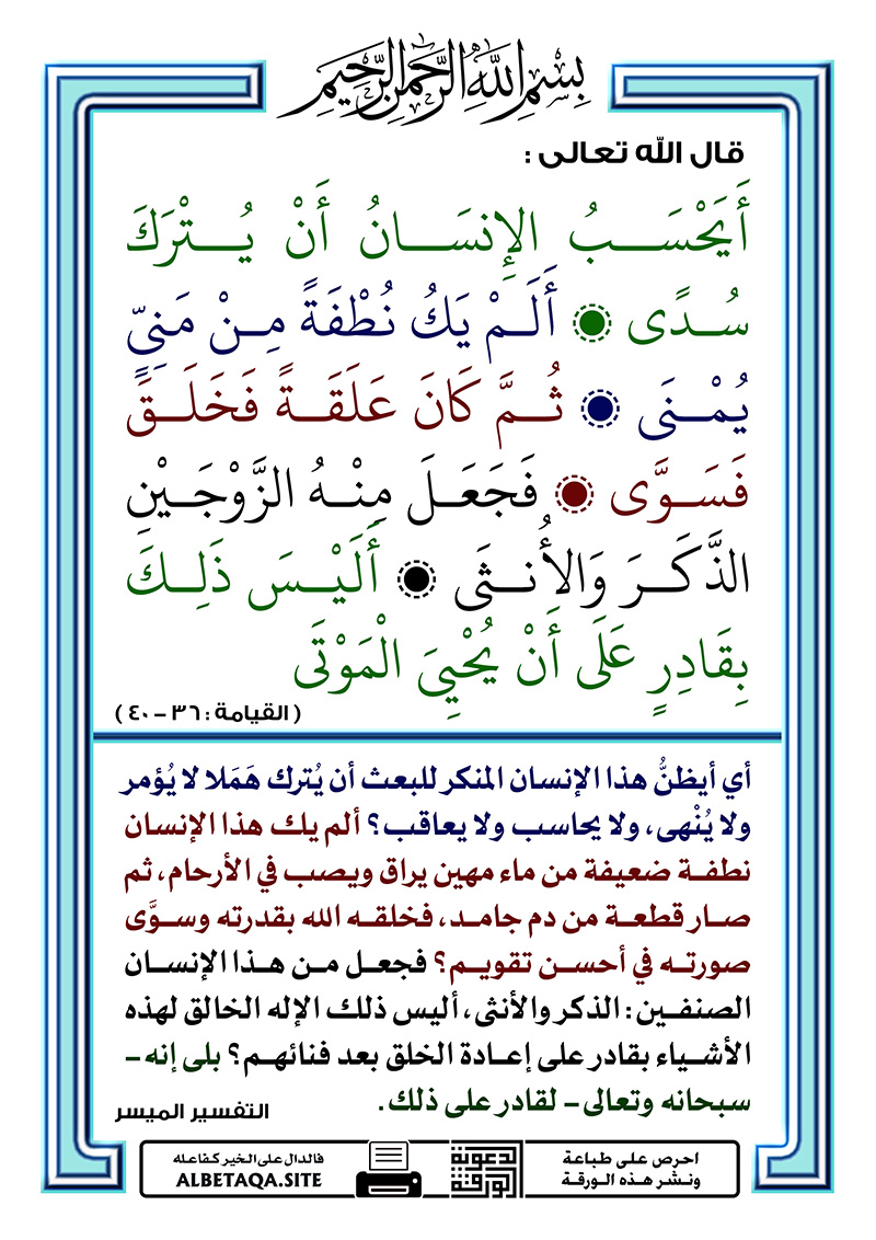 أيحسب الإنسان أن يترك سدى ، ألم يك نطفة من مني يمنى ، ثم كان علقة فخلق فسوى ، فجعل منه الزوجين الذكر والأنثى ، أليس ذلك بقادر على أن يحيي الموتى
