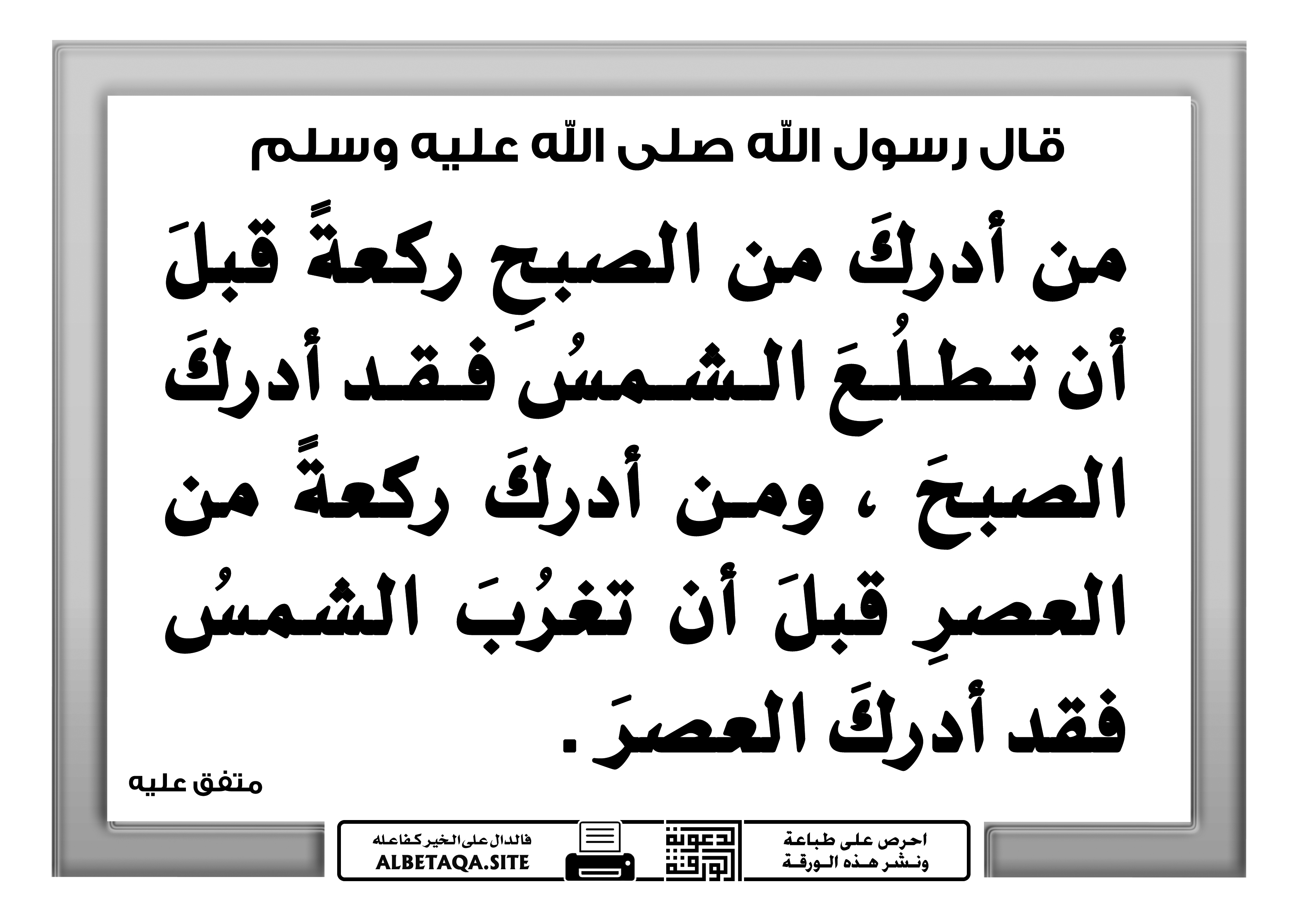 من أدرك من الصبح ركعة قبل أن تطلع الشمس ، فقد أدرك الصبح ، ومن أدرك ركعة من العصر قبل أن تغرب الشمس فقد أدرك العصر .