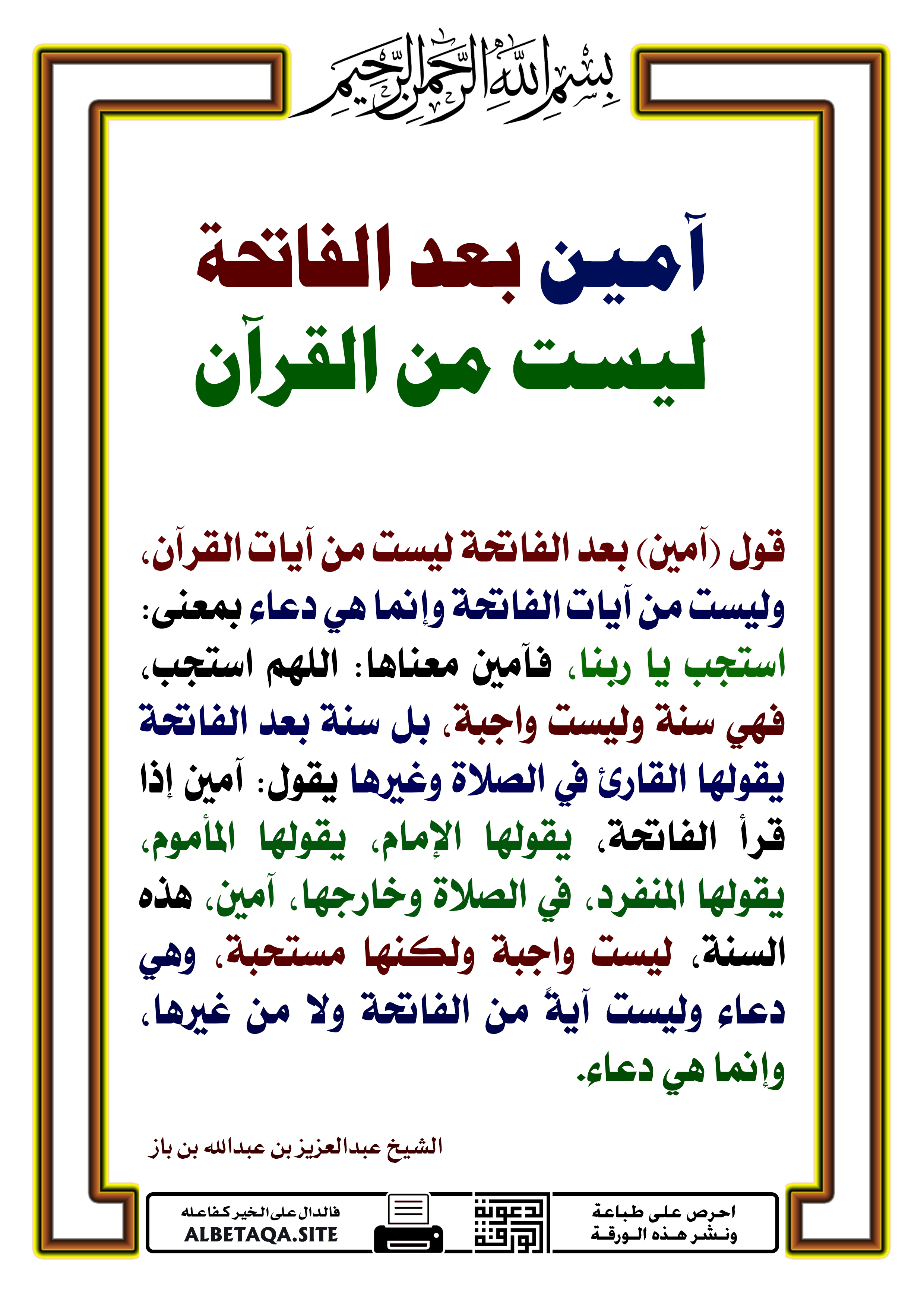 قول (آمين) بعد الفاتحة ليست من آيات القرآن، وليست من آيات الفاتحة وإنما هي دعاء بمعنى: استجب يا ربنا، فآمين معناها: اللهم استجب، فهي سنة وليست واجبة، بل سنة بعد الفاتحة يقولها القارئ في الصلاة وغيرها يقول: آمين إذا قرأ الفاتحة، يقولها الإمام، يقولها المأموم، يقولها المنفرد، في الصلاة وخارجها، آمين، هذه السنة، ليست واجبة ولكنها مستحبة، وهي دعاء وليست آية من الفاتحة ولا من غيرها، وإنما هي دعاء.