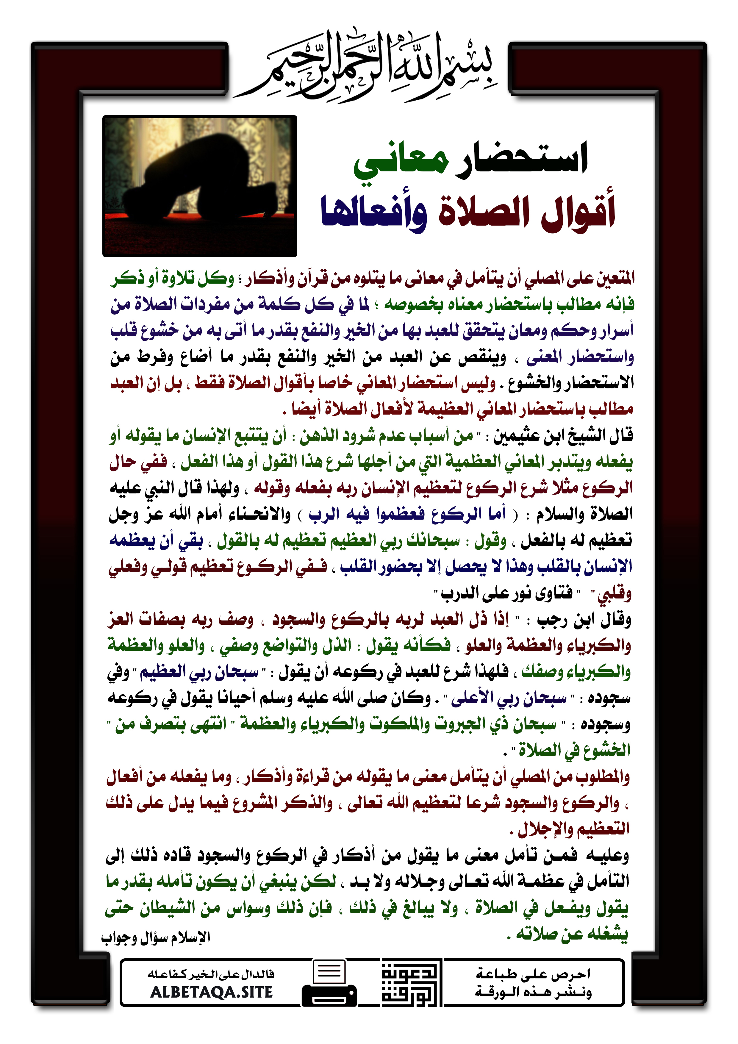 وليس استحضار المعاني خاصا بأقوال الصلاة فقط ، بل إن العبد مطالب باستحضار المعاني العظيمة لأفعال الصلاة أيضا .