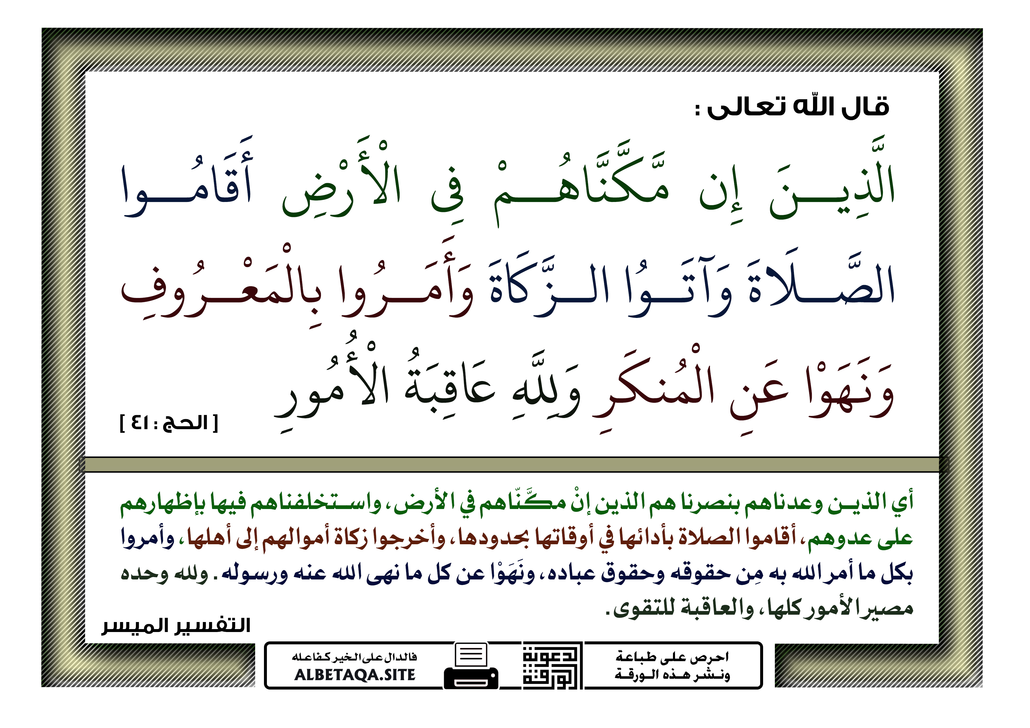 الذين إن مكناهم في الأرض أقاموا الصلاة وآتوا الزكاة وأمروا بالمعروف ونهوا عن المنكر ولله عاقبة الأمور