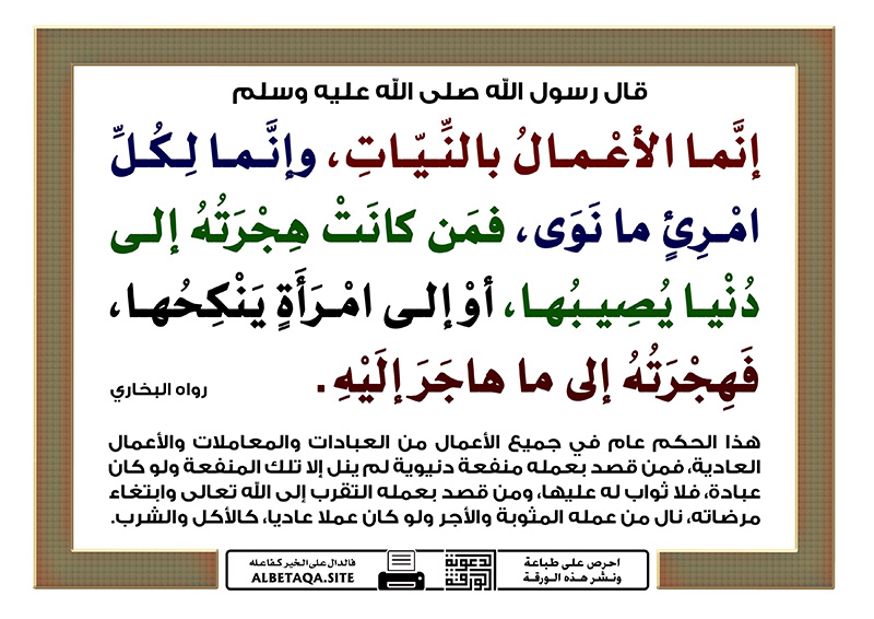 إنما الأعمال بالنيات، وإنما لكل امرئ ما نوى، فمن كانت هجرته إلى دنيا يصيبها، أو إلى امرأة ينكحها، فهجرته إلى ما هاجر إليه.