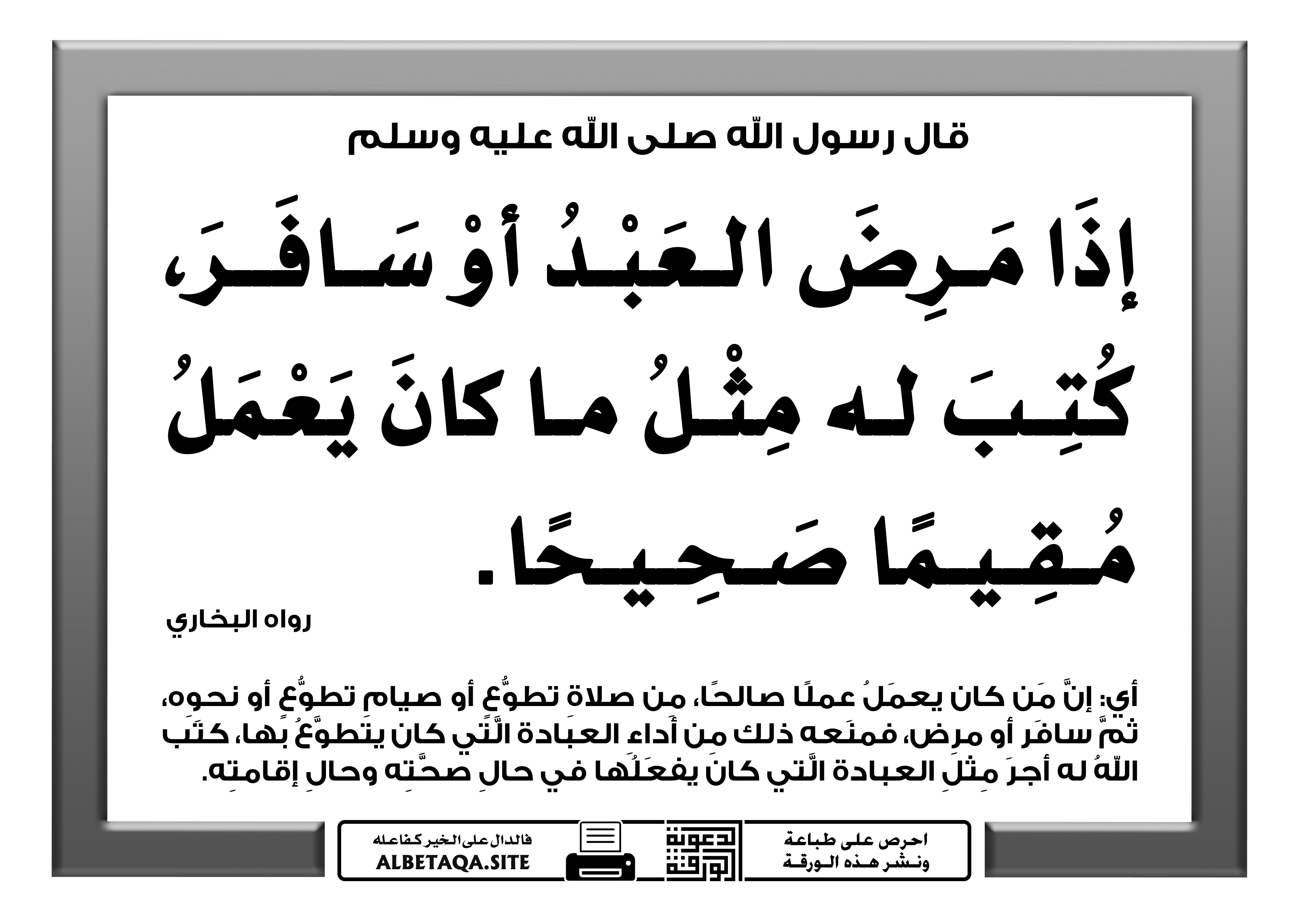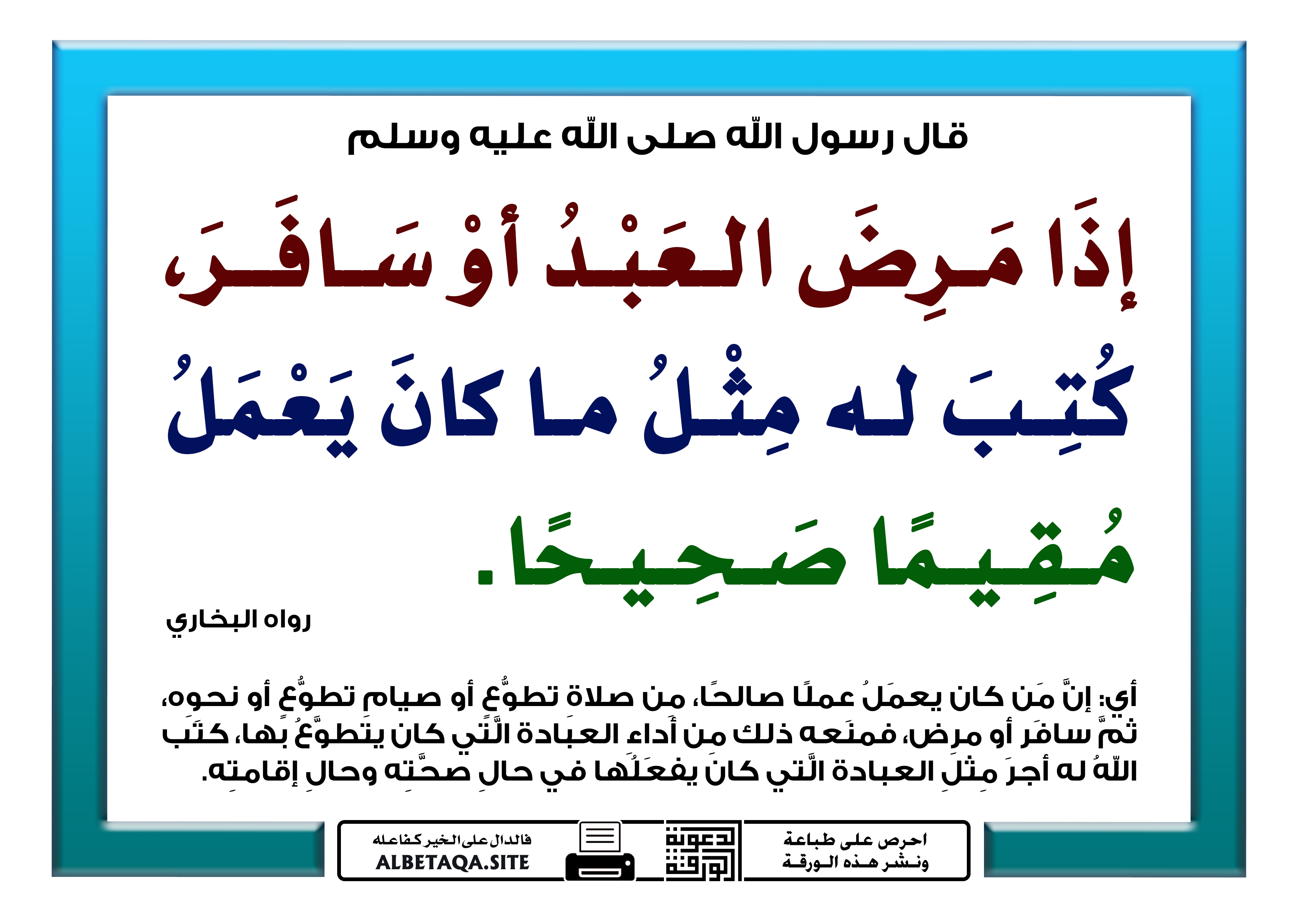 إذا مرض العبد أو سافر، كتب له مثل ما كان يعمل مقيما صحيحا.