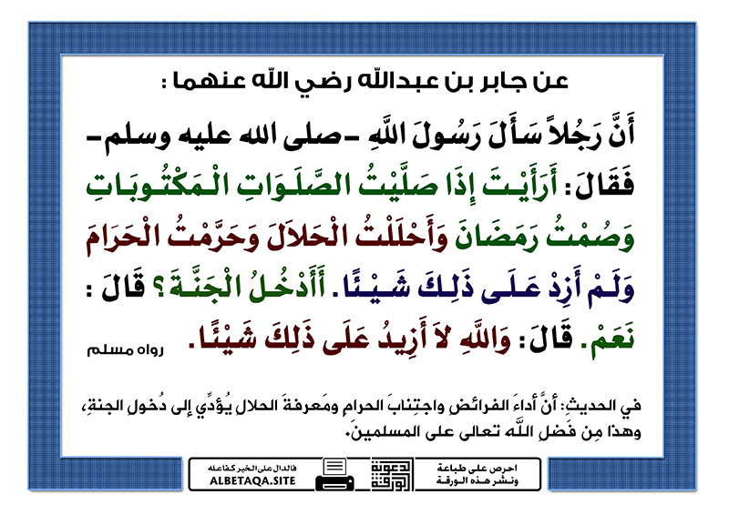أن رجلا سأل رسول الله -صلى الله عليه وسلم- فقال أرأيت إذا صليت الصلوات المكتوبات وصمت رمضان وأحللت الحلال وحرمت الحرام ولم أزد على ذلك شيئا أأدخل الجنة قال « نعم ». قال والله لا أزيد على ذلك شيئا.