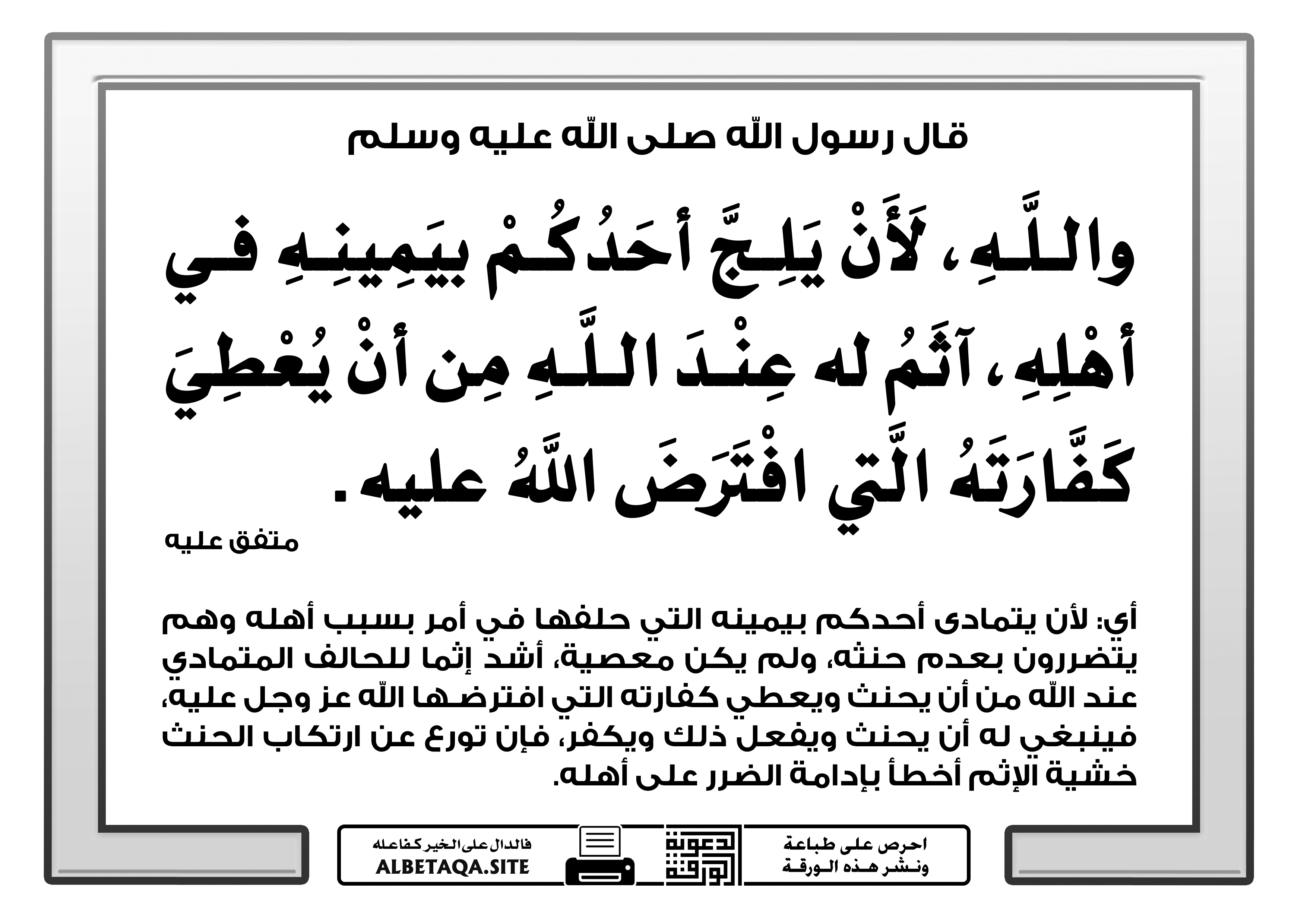 والله، لأن يلج أحدكم بيمينه في أهله، آثم له عند الله من أن يعطي كفارته التي افترض الله عليه.