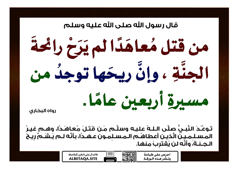 توعد النبي صلى الله عليه وسلم من قتل معاهدا، وهم غير المسلمين الذين أعطاهم المسلمون عهدا، بأنه لم يشم ريح الجنة، وأنه لن يقترب منها.