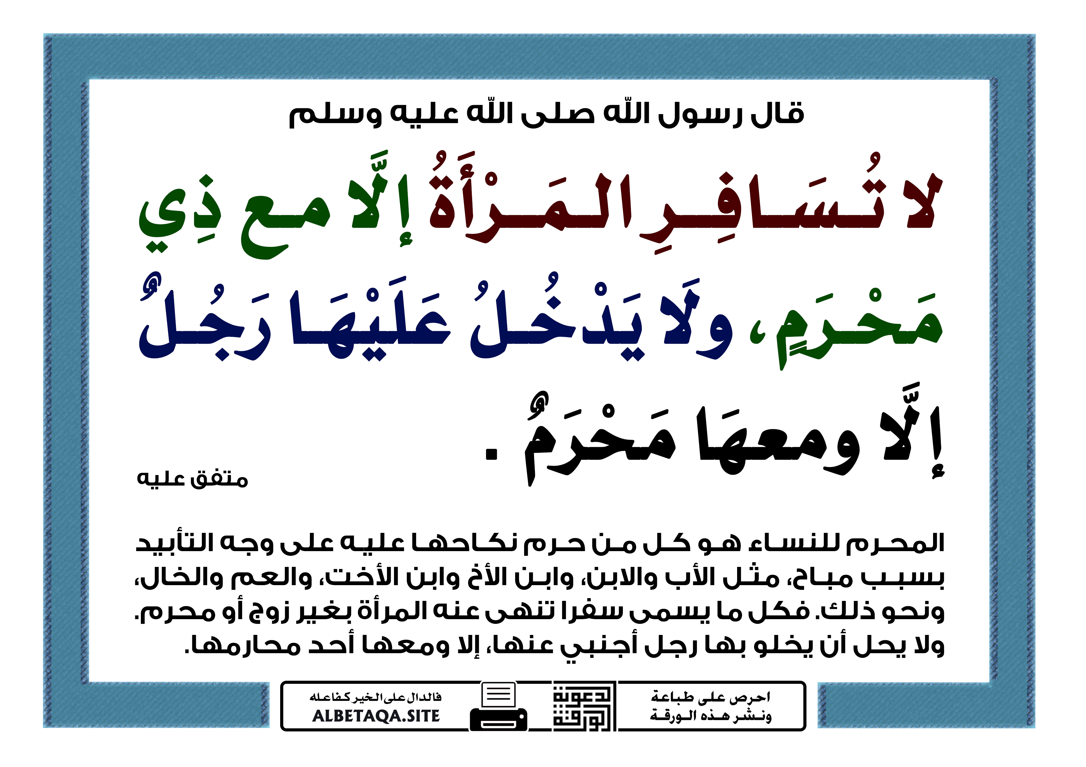 لا تسافر المرأة إلا مع ذي محرم، ولا يدخل عليها رجل إلا ومعها محرم .