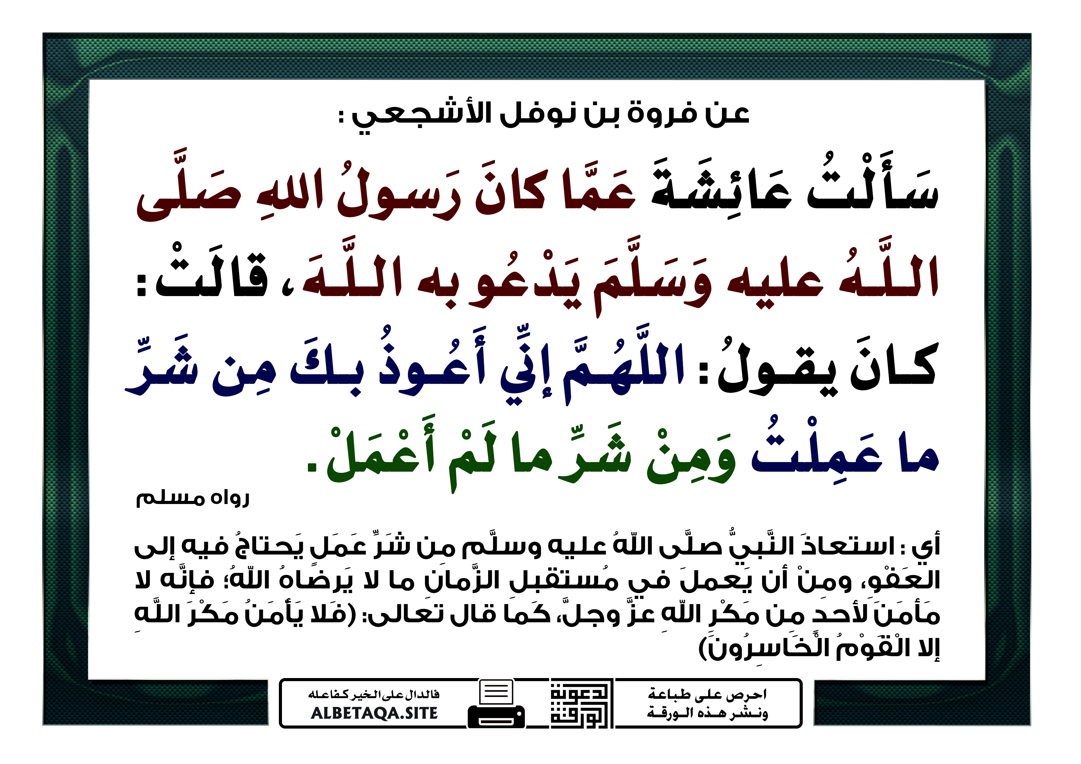 سألت عائشة عما كان رسول الله صلى الله عليه وسلم يدعو به الله، قالت: كان يقول: اللهم إني أعوذ بك من شر ما عملت ومن شر ما لم أعمل.
