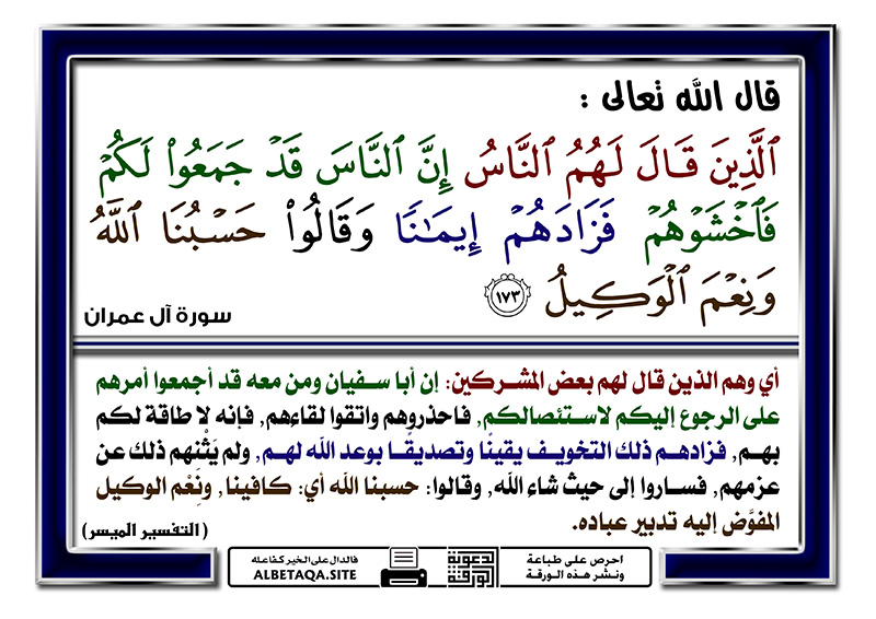 ” الذين قال لهم الناس إن الناس قد جمعوا لكم فاخشوهم فزادهم إيمانا وقالوا حسبنا الله ونعم الوكيل ”