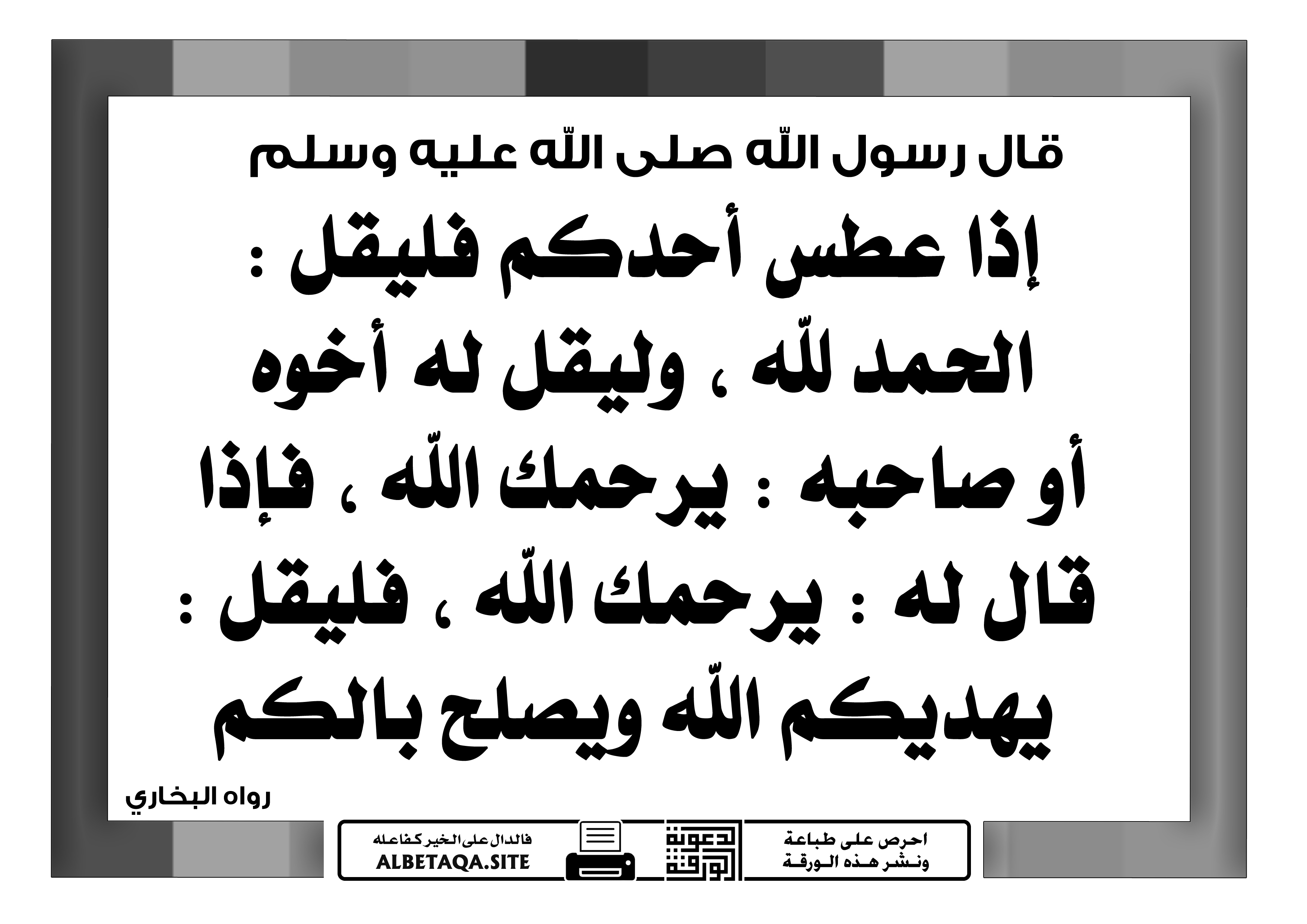 إذا عطس أحدكم فليقل : الحمد لله ، وليقل له أخوه أو صاحبه : يرحمك الله ، فإذا قال له : يرحمك الله ، فليقل : يهديكم الله ويصلح بالكم