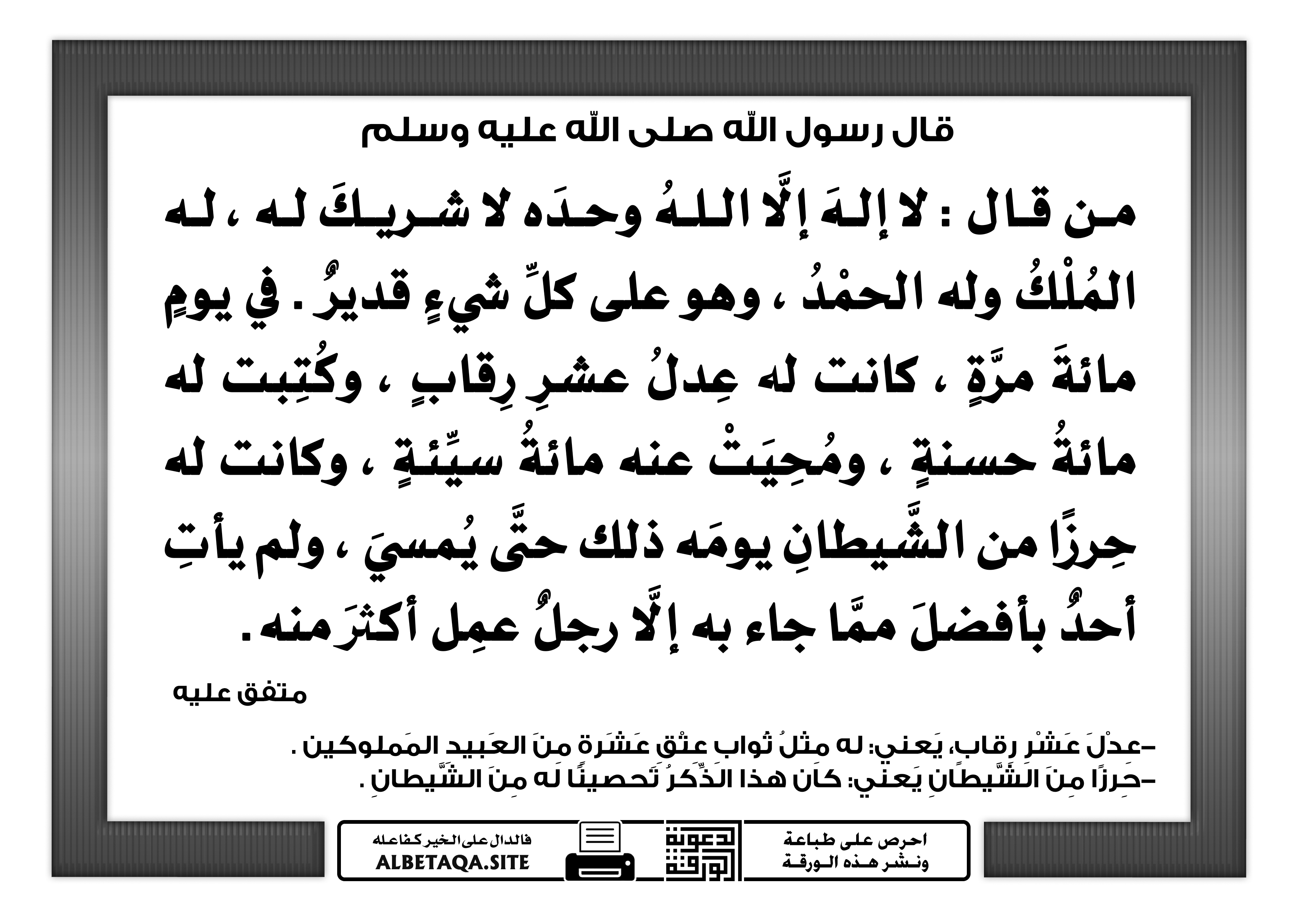 من قال : لا إله إلا الله وحده لا شريك له ، له الملك وله الحمد ، وهو على كل شيء قدير . في يوم مائة مرة ، كانت له عدل عشر رقاب ، وكتبت له مائة حسنة ، ومحيت عنه مائة سيئة ، وكانت له حرزا من الشيطان يومه ذلك حتى يمسي ، ولم يأت أحد بأفضل مما جاء به إلا رجل عمل أكثر منه.