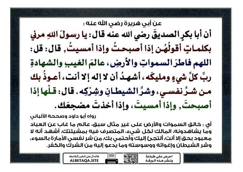أن أبا بكر الصديق رضي الله عنه قال يا رسول الله مرني بكلمات أقولهن إذا أصبحت وإذا أمسيت, قال : قل: اللهم فاطر السموات والأرض عالم الغيب والشهادة رب كل شيء ومليكه، أشهد أن لا إله إلا أنت، أعوذ بك من شر نفسي، وشر الشيطان وشركه. قال: قلها إذا أصبحت, وإذا أمسيت، وإذا أخذت مضجعك.