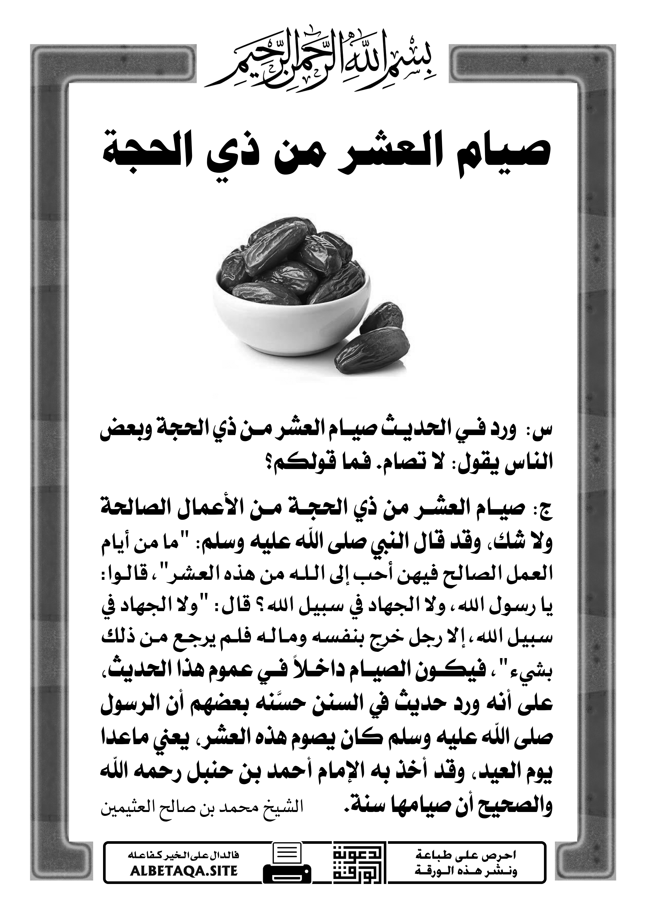 ج: صيام العشر من ذي الحجة من الأعمال الصالحة ولا شك، وقد قال النبي صلى الله عليه وسلم: “ما من أيام العمل الصالح فيهن أحب إلى الله من هذه العشر”، قالوا: يا رسول الله، ولا الجهاد في سبيل الله؟ قال: “ولا الجهاد في سبيل الله، إلا رجل خرج بنفسه وماله فلم يرجع من ذلك بشيء”، فيكون الصيام داخلا في عموم هذا الحديث، على أنه ورد حديث في السنن حسنه بعضهم أن الرسول صلى الله عليه وسلم كان يصوم هذه العشر، يعني ماعدا يوم العيد، وقد أخذ به الإمام أحمد بن حنبل رحمه الله والصحيح أن صيامها سنة.