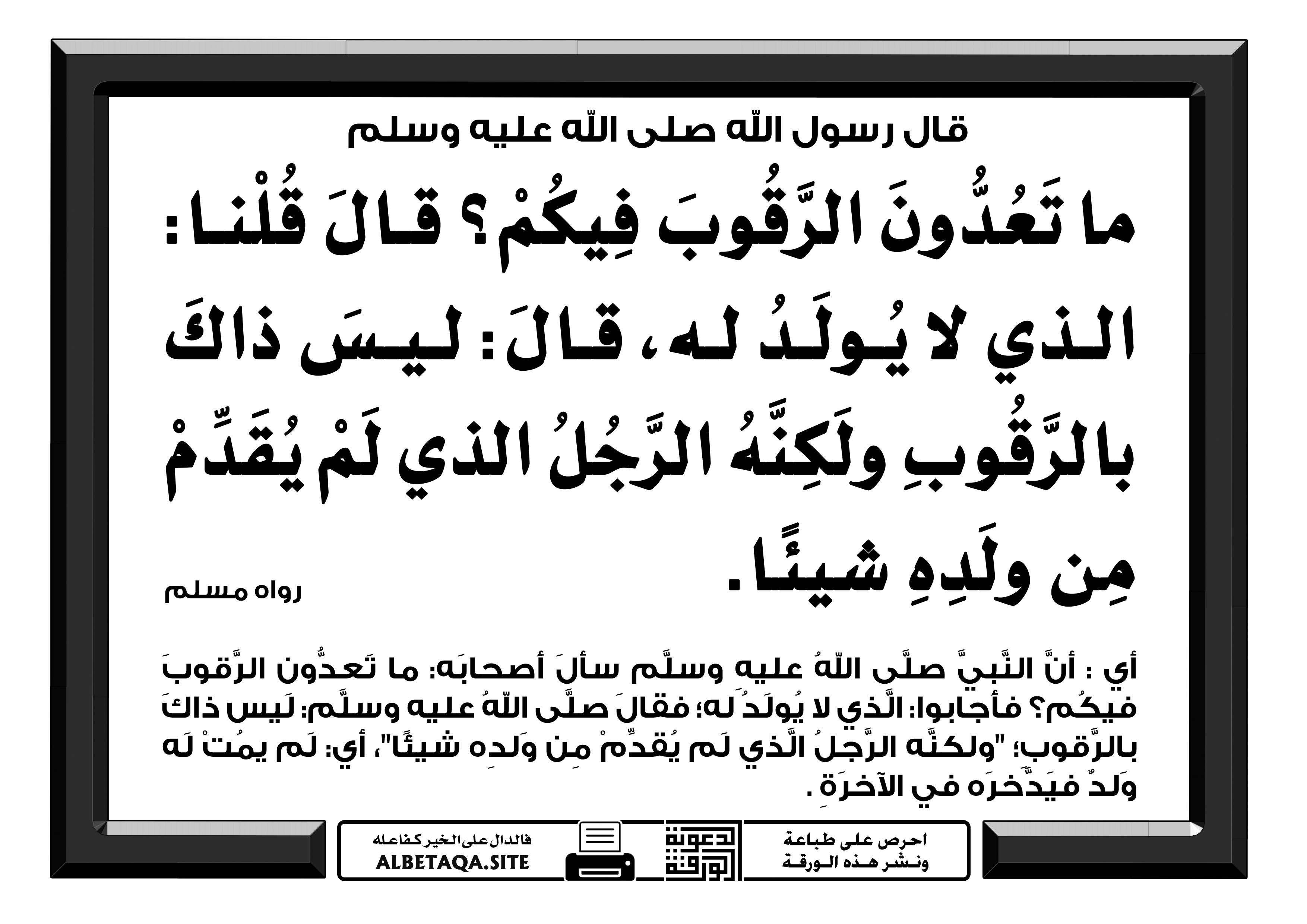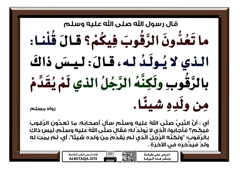 ما تعدون الرقوب فيكم؟ قال قلنا: الذي لا يولد له، قال: ليس ذاك بالرقوب ولكنه الرجل الذي لم يقدم من ولده شيئا