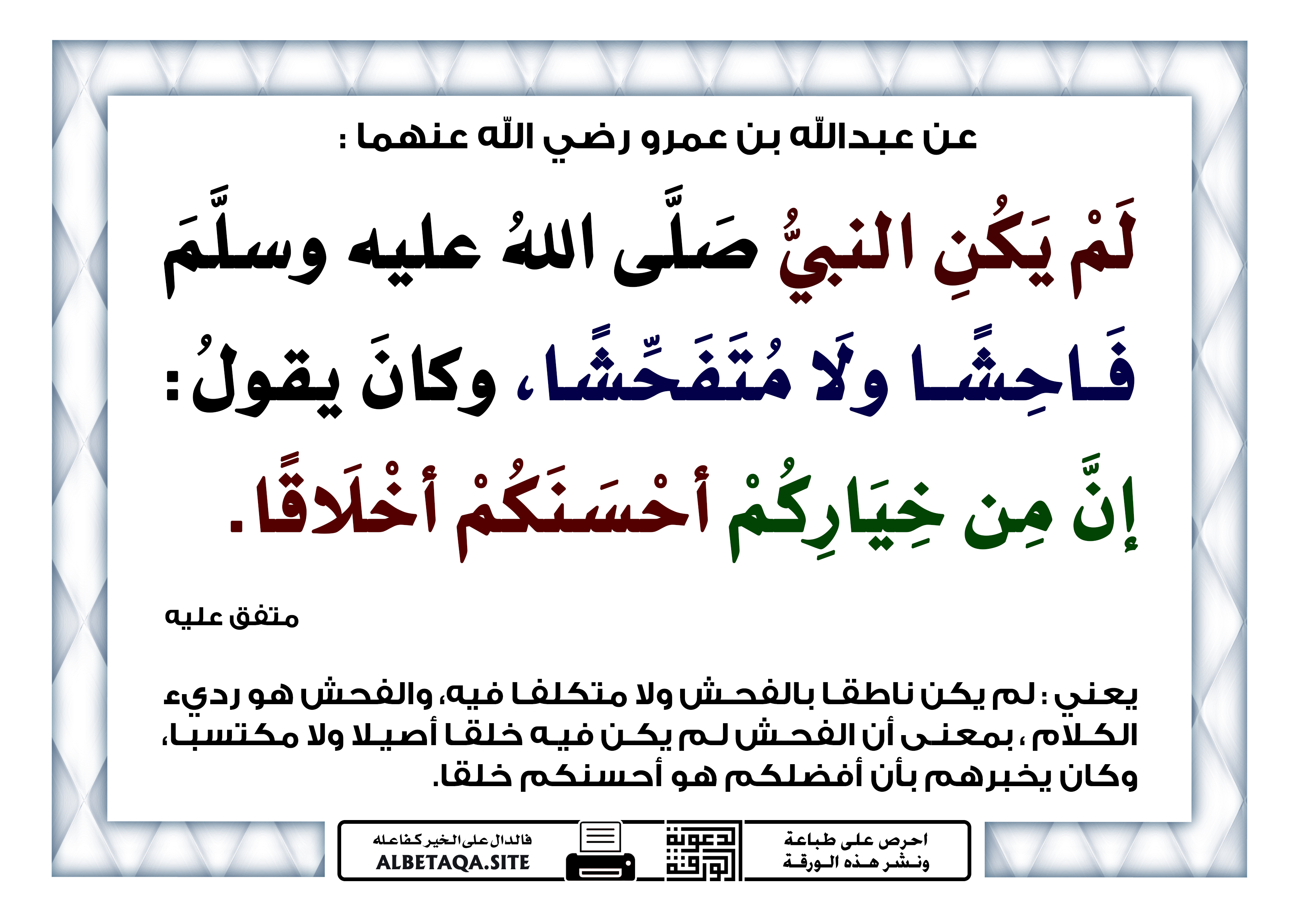 لم يكن النبي صلى الله عليه وسلم فاحشا ولا متفحشا، وكان يقول: إن من خياركم أحسنكم أخلاقا.