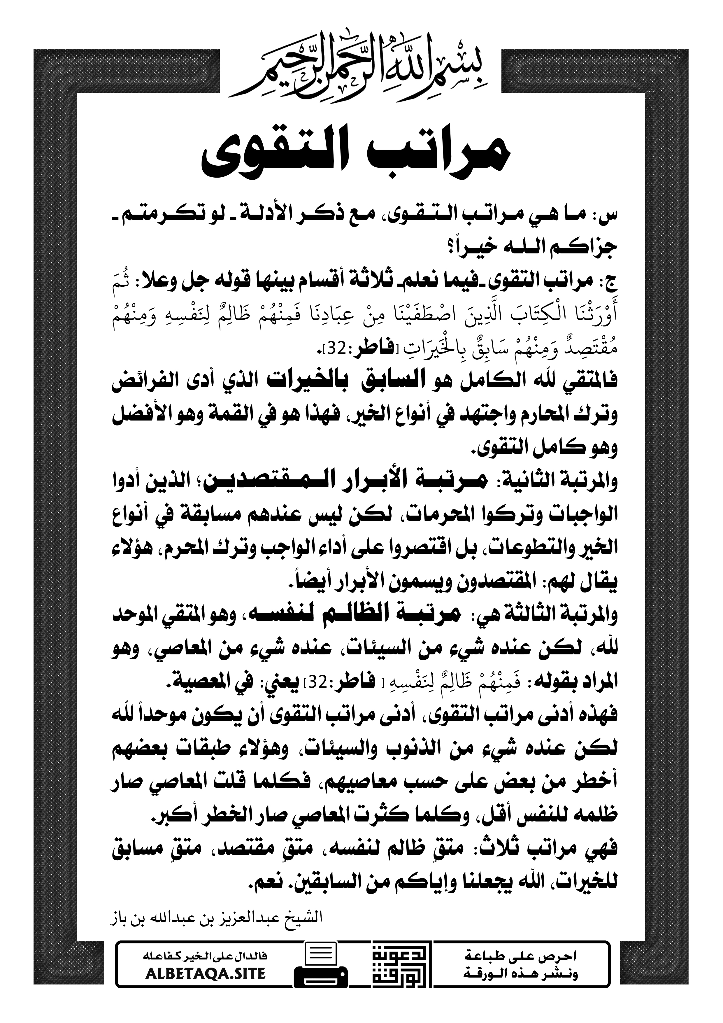 ج: مراتب التقوى -فيما نعلم- ثلاثة أقسام بينها قوله جل وعلا: ثم أورثنا الكتاب الذين اصطفينا من عبادنا فمنهم ظالم لنفسه ومنهم مقتصد ومنهم سابق بالخيرات [فاطر:32].