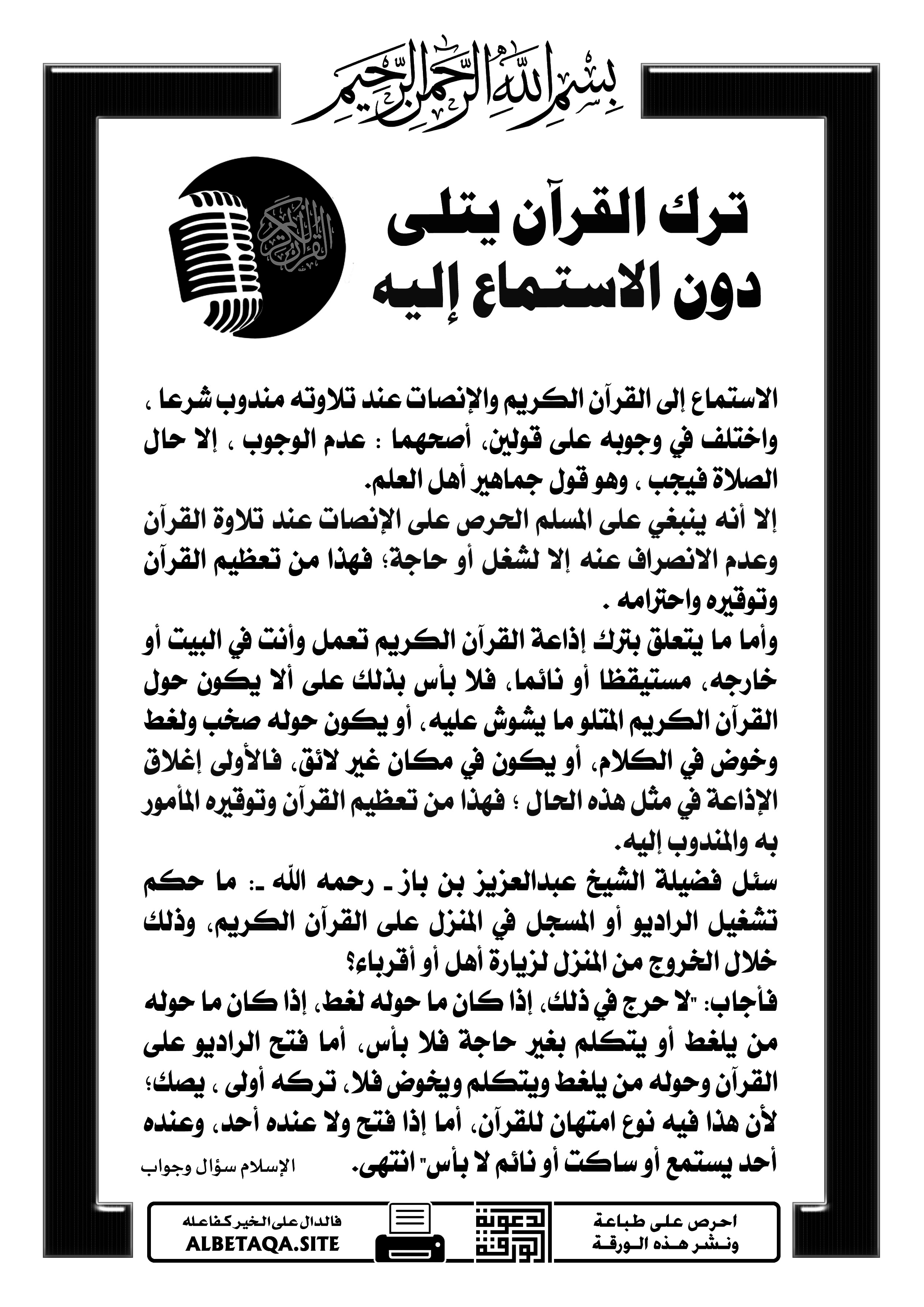 فأجاب: “لا حرج في ذلك، إذا كان ما حوله لغط، إذا كان ما حوله من يلغط أو يتكلم بغير حاجة فلا بأس، أما فتح الراديو على القرآن وحوله من يلغط ويتكلم ويخوض فلا، تركه أولى ، يصك؛ لأن هذا فيه نوع امتهان للقرآن، أما إذا فتح ولا عنده أحد، وعنده أحد يستمع أو ساكت أو نائم لا بأس” انتهى.