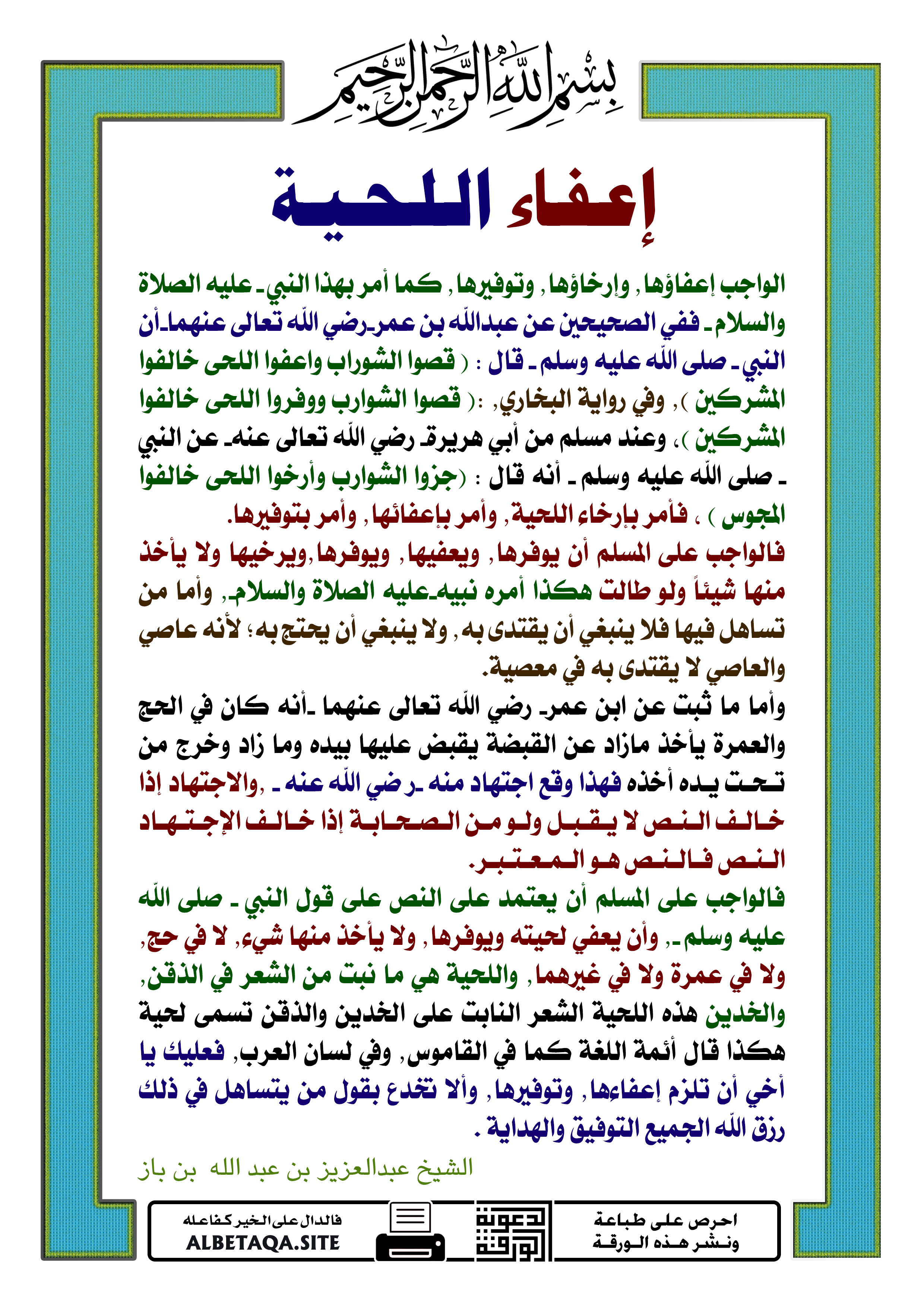 الواجب إعفاؤها, وإرخاؤها, وتوفيرها, كما أمر بهذا النبي-عليه الصلاة والسلام- ففي الصحيحين عن عبدالله بن عمر-رضي الله تعالى عنهما-أن النبي – صلى الله عليه وسلم – قال : ( قصوا الشوراب واعفوا اللحى خالفوا المشركين ), وفي رواية البخاري, :( قصوا الشوارب ووفروا اللحى خالفوا المشركين )، وعند مسلم من أبي هريرة- رضي الله تعالى عنه- عن النبي – صلى الله عليه وسلم – أنه قال : (جزوا الشوارب وأرخوا اللحى خالفوا المجوس ) ، فأمر بإرخاء اللحية, وأمر بإعفائها, وأمر بتوفيرها.