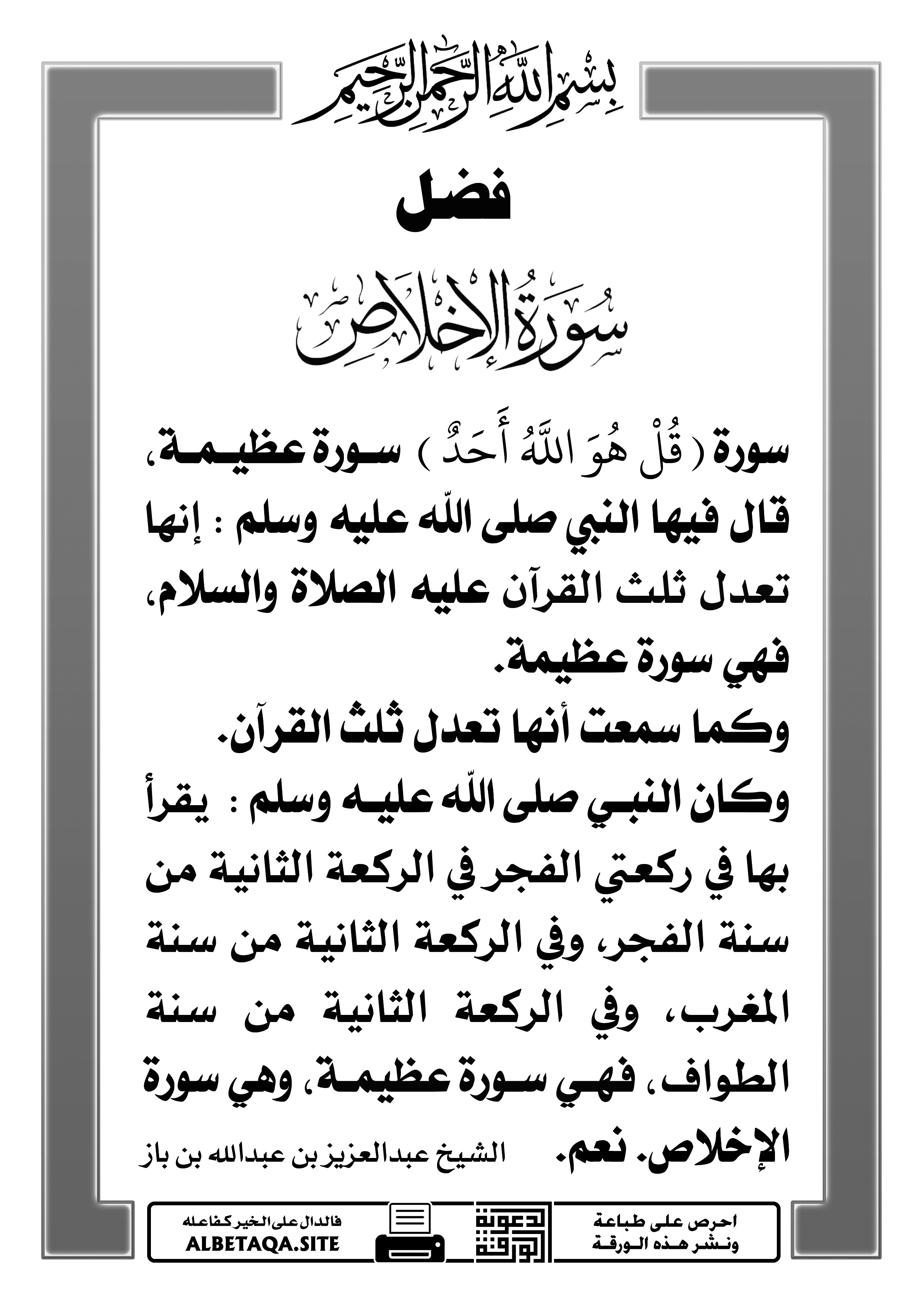 وكان النبي صلى الله عليه وسلم : يقرأ بها في ركعتي الفجر في الركعة الثانية من سنة الفجر، وفي الركعة الثانية من سنة المغرب، وفي الركعة الثانية من سنة الطواف، فهي سورة عظيمة، وهي سورة الإخلاص. نعم.