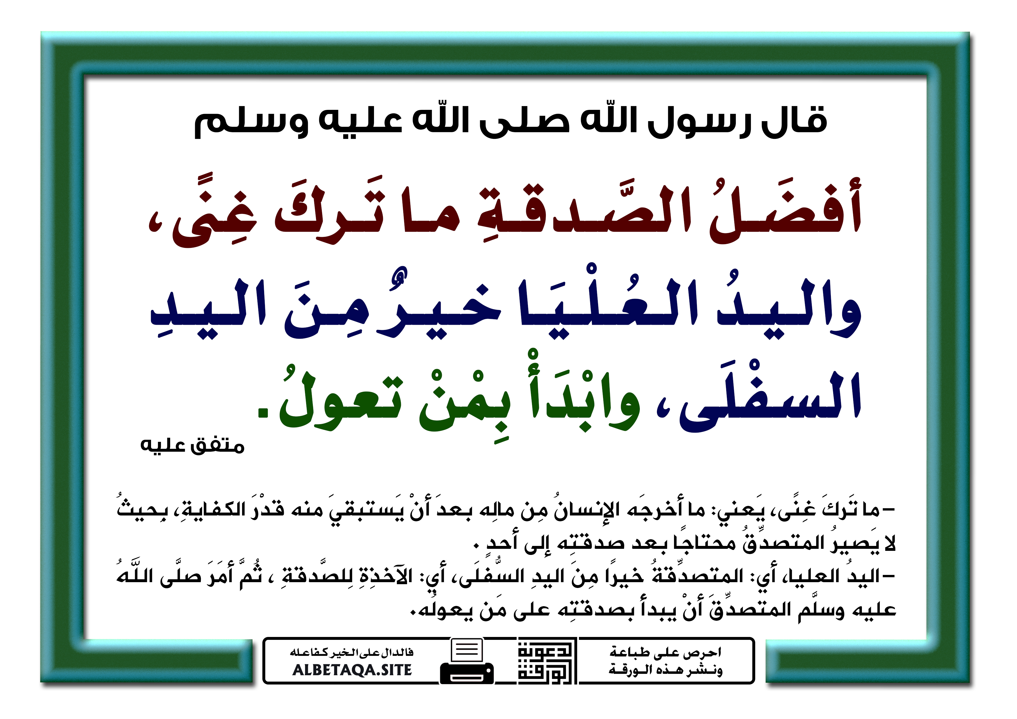 أفضل الصدقة ما ترك غنى، واليد العليا خير من اليد السفلى، وابدأ بمن تعول